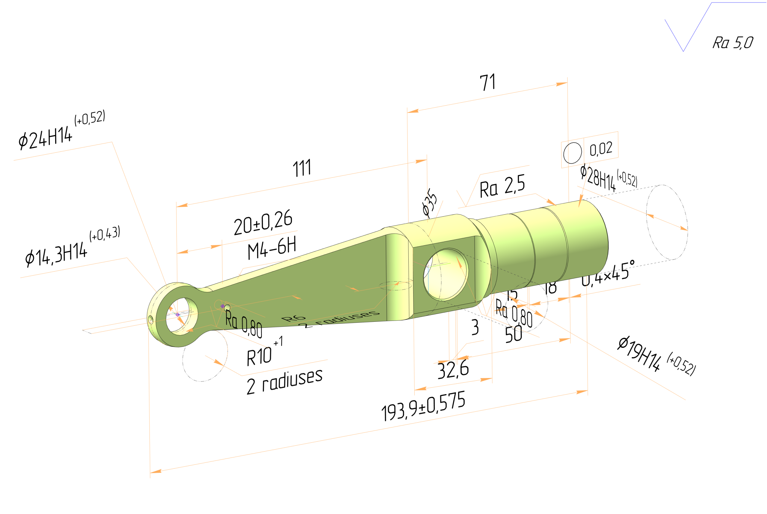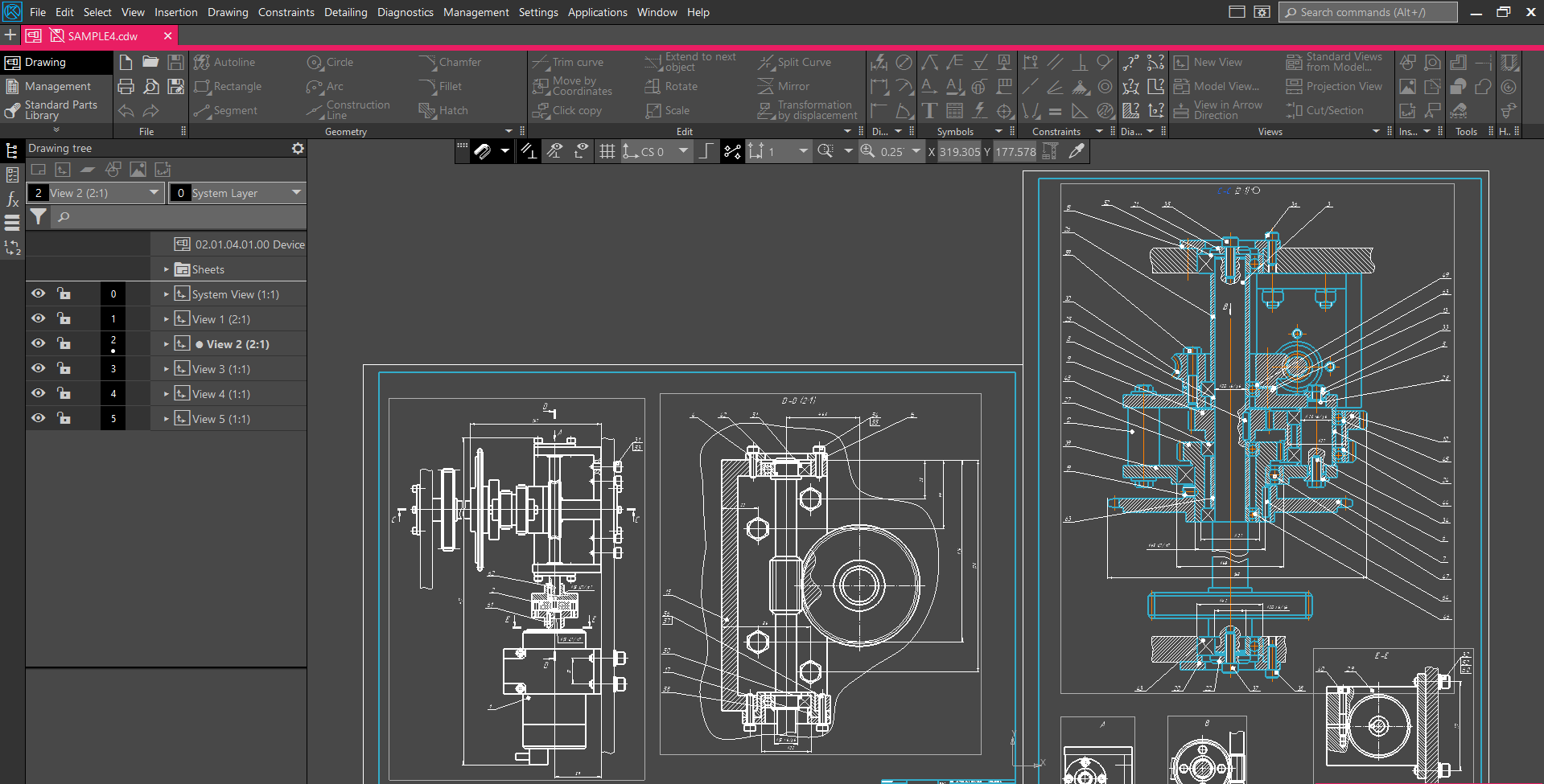 Standard views are automatically constructed, with links to projections. The properties of 2D drawings, such as designation, description, and weight, are synchronized with the 3D model.